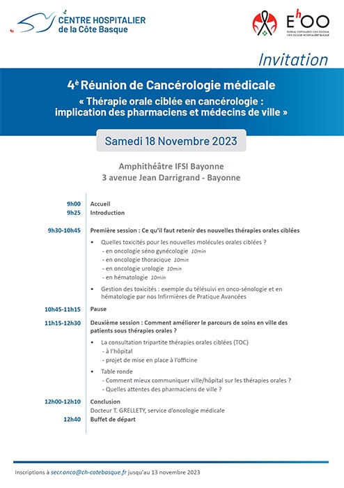 L’association EhOO (Euskal Ospitaleko Oncologia) et le service oncologie du Centre Hospitalier de la Côte Basque invitent médecins et pharmaciens du Pays Basque et du sud des Landes à la 4ème réunion de Cancérologie médicale qui aura lieu le samedi 18 novembre 2023 dans les locaux de l’Institut de Formation en Soins Infirmiers de Bayonne (IFSI) 3 avenue Jean Darrigrand à Bayonne
