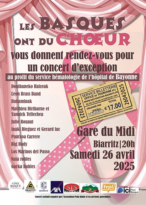 Merci aux nombreux artistes du Pays Basque qui ont répondu à l’appel de Gorka Robles et d’Eric Cahuzac de l’association “Pena Kimio” pour participer au concert “Les Basques ont du Chœur” le samedi 26 avril à la Gare du Midi à Biarritz, au profit des services d’oncologie, d’hématologie et de l’Hôpital de jour de Cancérologie du Centre Hospitalier de la Côte Basque