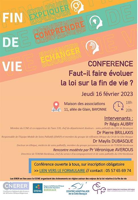 L’Espace de Réflexion Éthique de Nouvelle Aquitaine (ERENA) en collaboration avec le Groupe Éthique du Centre Hospitalier de la Côte Basque invite professionnels et grand public à une conférence dans le cadre du débat national sur la fin de vie autour du thème « Faut-il faire évoluer la loi sur la fin de vie » le jeudi 16 février à 18 h à la Maison des Associations à Bayonne.