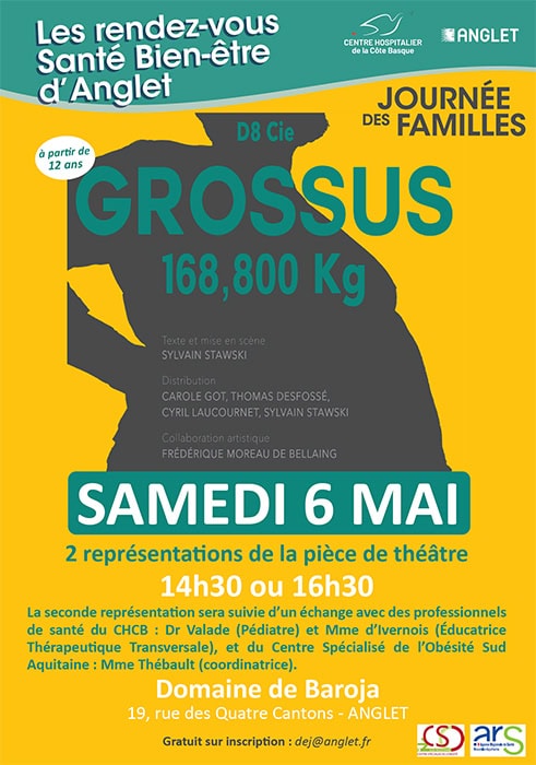 Par ailleurs, les représentations , à 14h30 ou à 16h30 , de la pièce de théâtre « GROSSUS 168,800kg « créé par la compagnie D8 cie dans le cadre de la politique de stigmatisation de l’obésité constitueront un temps fort de cette manifestation.