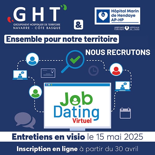 Dans le cadre de leurs politiques de Ressources Humaines le Groupement Hospitalier de Territoire Navarre Côte Basque et l’Hôpital Marin de Hendaye – APHP (Assistance Publique des Hôpitaux de Paris) s’ascocient et organisent un Job Dating virtuel visant à recruter des candidats souhaitant venir ou revenir travailler au Pays Basque.