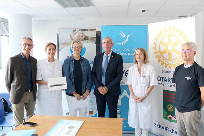 Une tablette Samsung a d’abord été remise au Dr. Sophie Bernard, hématologue et Florence Sassier cadre de santé oncologie/hématologie. Financée grâce à un don du Rotary Club Biarritz Bayonne Anglet, la tablette est destinée aux patients du secteur protégé en Hématologie.