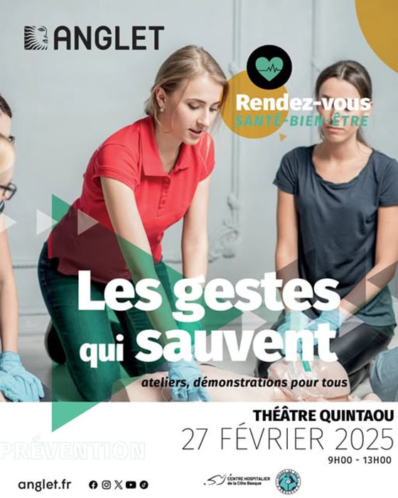 Dans le cadre des Rendez-vous Santé Bien-être, la Ville d’Anglet et le Centre Hospitalier de la Côte Basque proposent une matinée d’information et de démonstrations autour des gestes qui sauvent le jeudi 27 février, de 9h à 13h, dans le hall du Théâtre Quintaou.