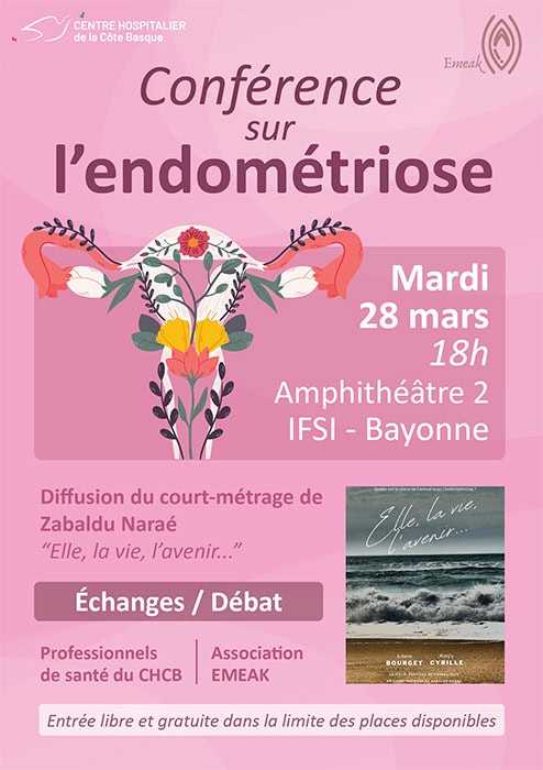 A l’occasion de ce mois d’information sur cette pathologie , le Centre Hospitalier de la Côte Basque et l’ association EMEAK proposent une soirée conférence sur l’endométriose s’appuyant sur la diffusion du court métrage « Elle, la vie l’avenir… » réalisé par Stéphanie ZABALDU.