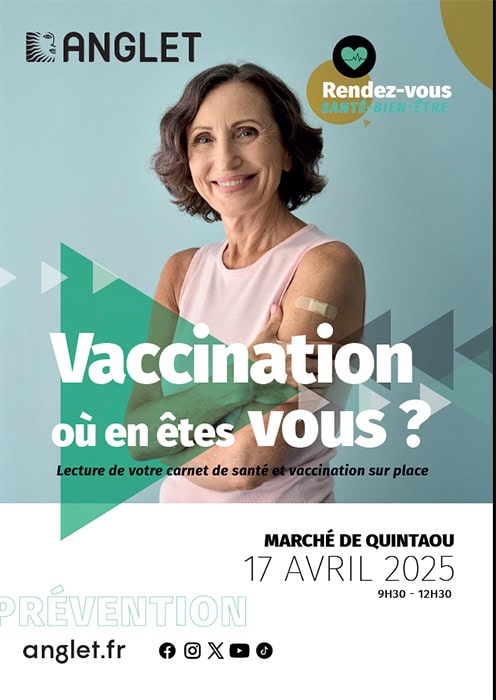Dans le cadre d’une collaboration entre le Centre Hospitalier de la Côte Basque et la Ville d’Anglet à l’occasion d’un Rendez Vous Santé Bien-être « spécial vaccination « organisé par la ville, les angloys sont invités à venir sur un stand d’information et de vaccination gratuite installé au cœur du Marché de Quintaou le jeudi 17 avril entre 9h et 12h30 animé par les professionnels de santé (médecins, infirmiers) du Centre Gratuit de Vaccination et du CEGGID , services du Centre Hospitalier de la Côte Basque