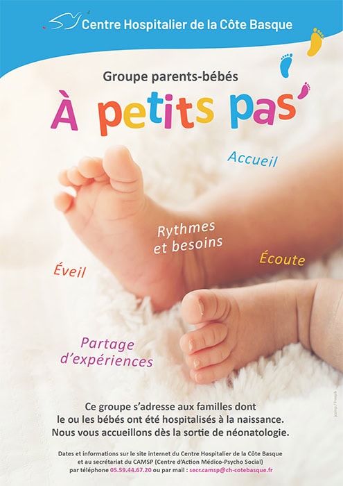 Le groupe parents-bébés « A Petits Pas » est animé par des professionnelles du CAMSP de Bayonne (Psychomotricienne, psychologue, infirmière). La participation au groupe n’est pas conditionnée par un suivi au CAMSP (Centre d’Action Médico-Sociale Précoce).