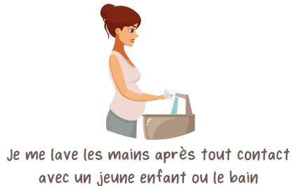 - Se laver soigneusement les mains à l’eau et au savon après chaque change ou contact avec les urines ou après chaque contact avec la salive (couche, pot, pyjama mouillé, jouets, repas, bain, …) ou ses secrétions nasales.