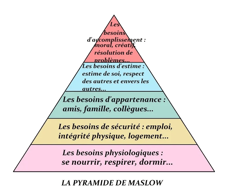 La pyramide de Maslow, ci contre, nous montre 5 types de besoins humains (physiologiques, sécuritaires,d’appartenance,d’estime et d’auto réalisation ou auto expression)